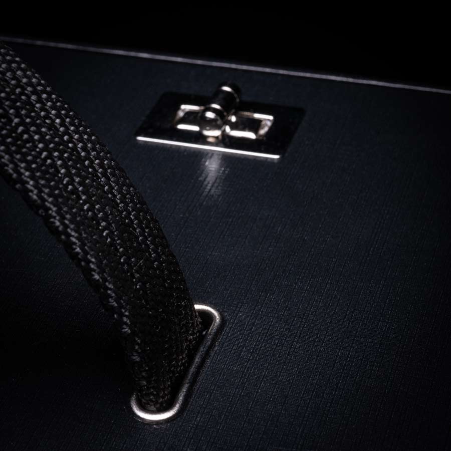 Cartone pressato, carta plastificata telata, foam, maniglia in tessuto tecnico, chiusure in metallo.