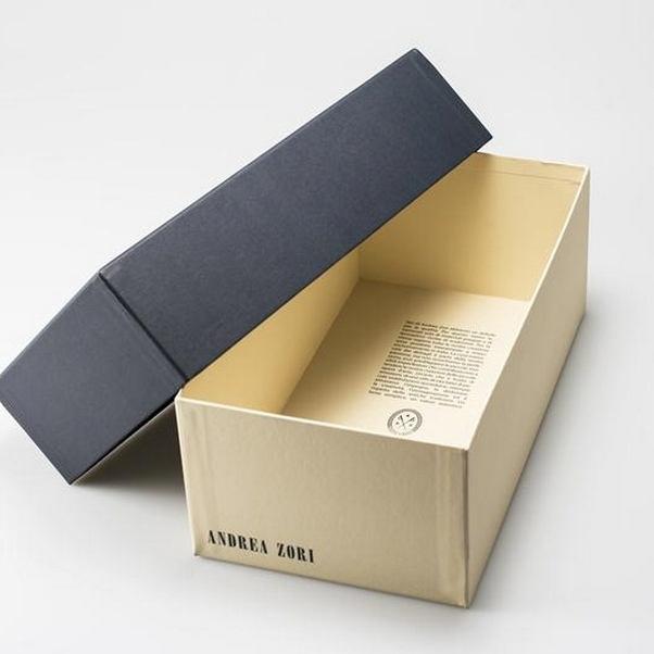 Una scatola pensata per valorizzare il brand ed esaltarne i pregi. All’interno trova il giusto spazio la descrizione dell’artigianalità della calzatura che si lega alla cura della scatola in cui è custodita.