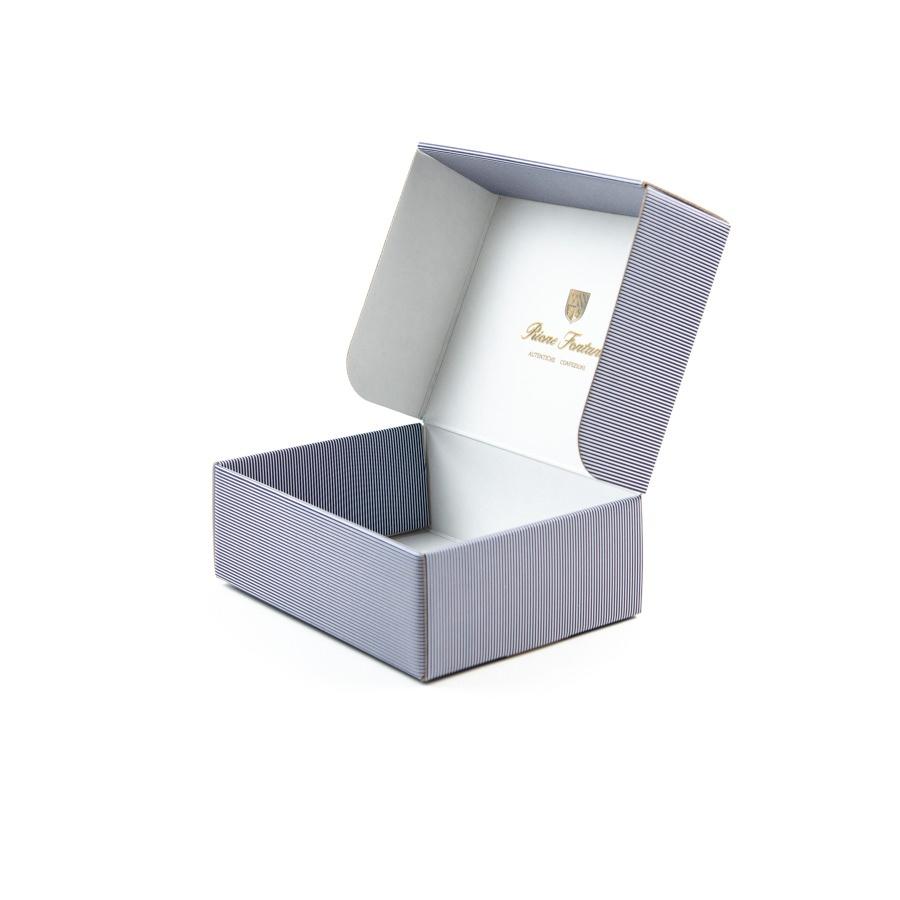 Piccola confezione per negozi e boutique per accessori, in carta rigata blue navy e bianco optical.