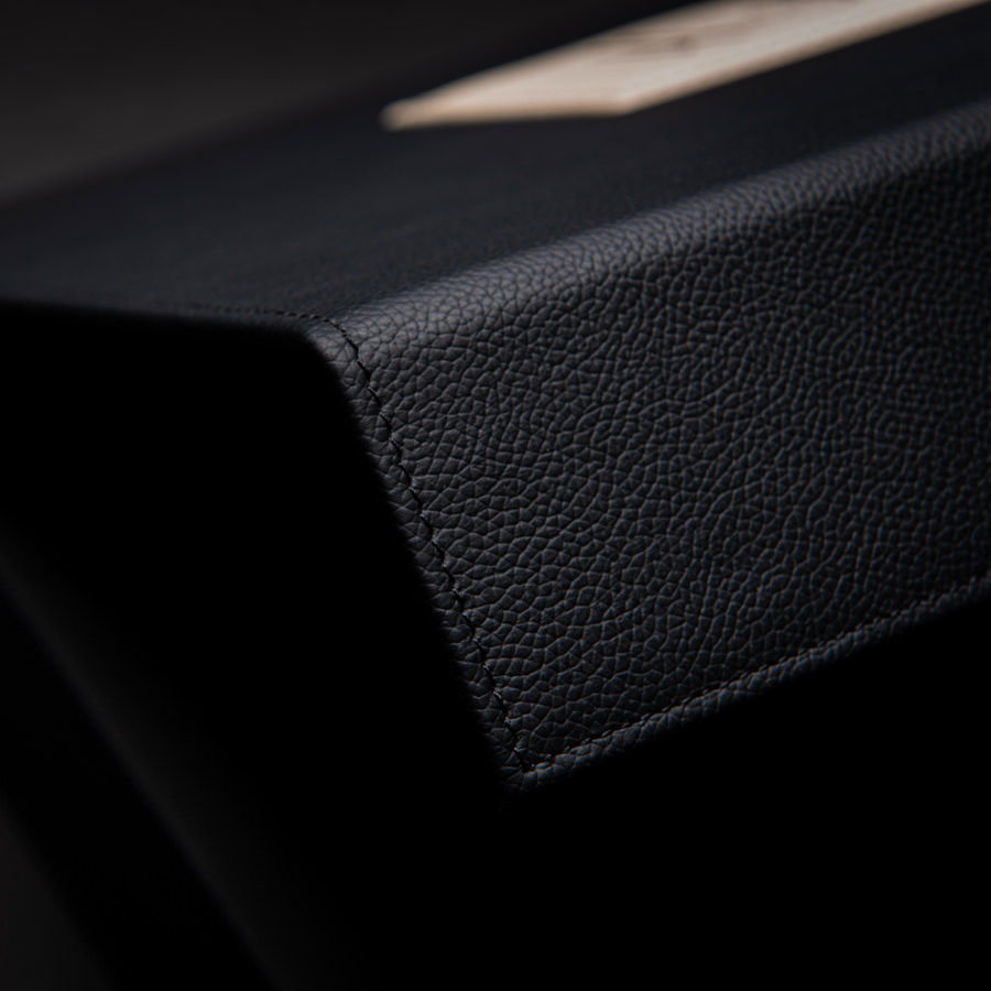 Anima in cartone pressato rivestita con vera pelle e interni in alcantara. Etichetta imbottita, stampata a caldo e cucita a mano.
