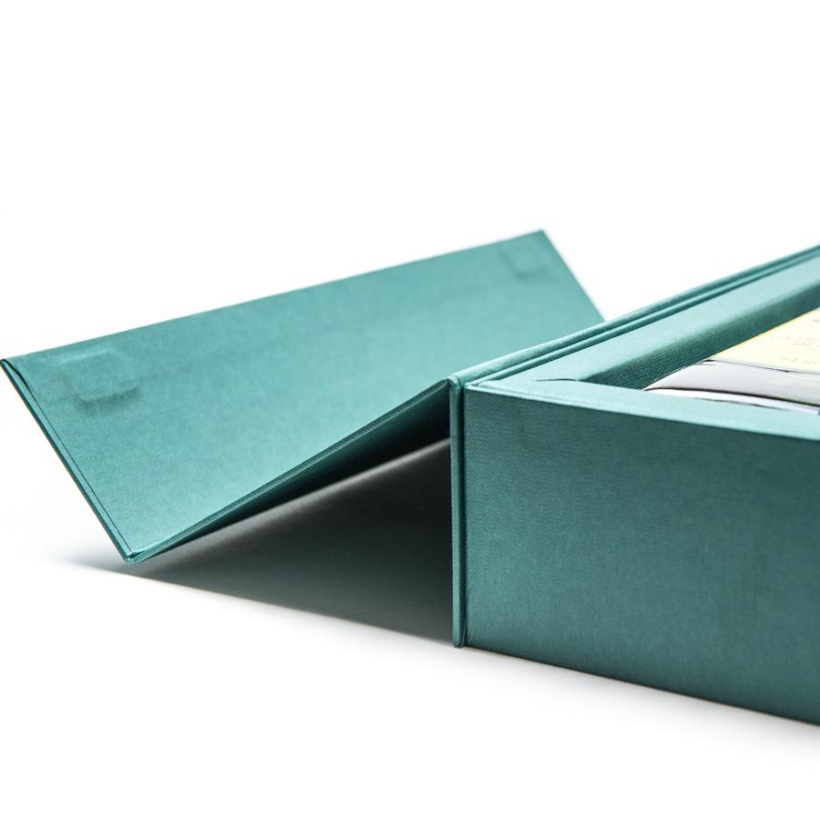 Pack in cartone pressato, rivestito con carta a nido d'ape, con stampa in lamina bianca. Cornice interna per proteggere la bottiglia e chiusura con magneti..